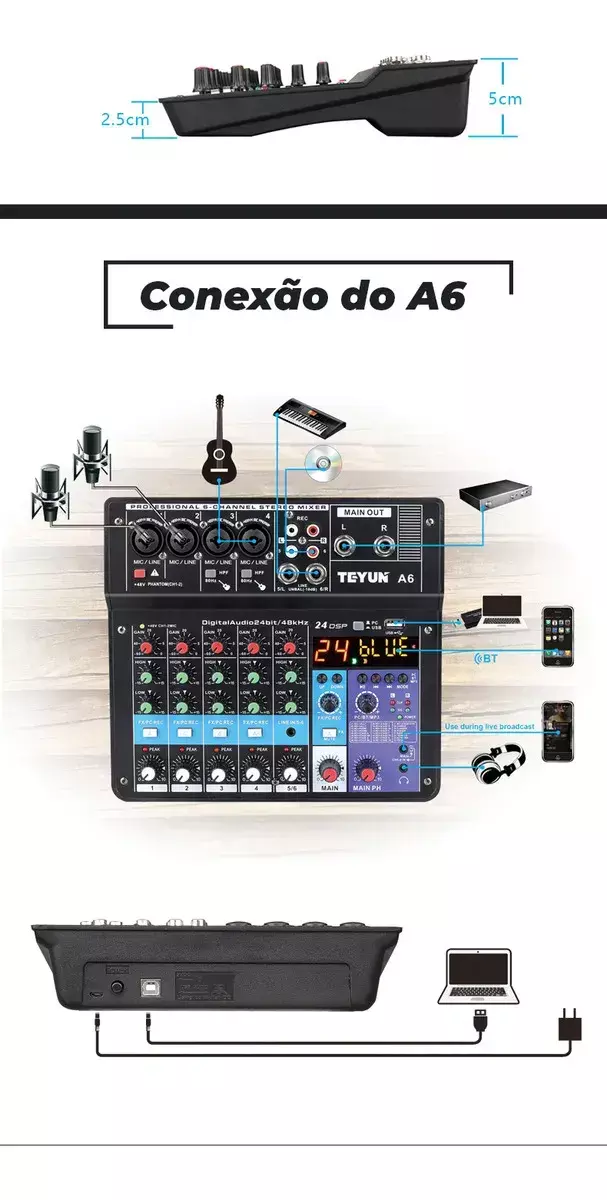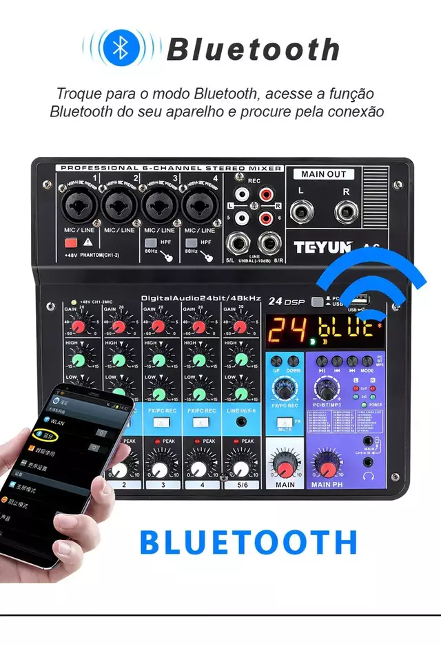 Se você busca qualidade sonora excepcional e versatilidade em um único equipamento, a Mesa de Som A6 é a escolha ideal para você! Desenvolvida pela renomada marca Teyun, esta mesa de som não apenas atende, mas supera as expectativas dos profissionais mais exigentes.